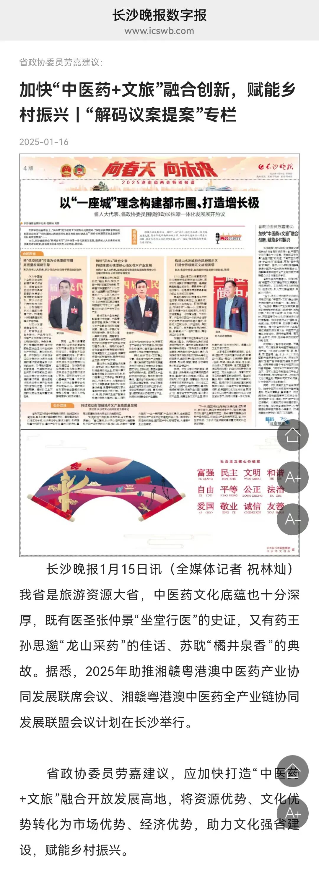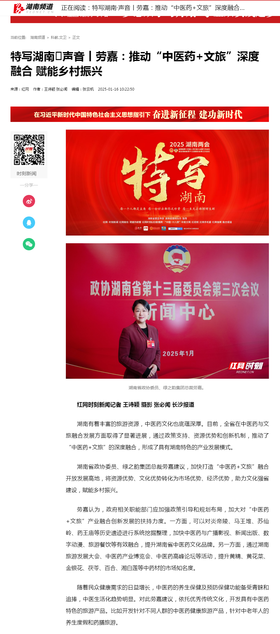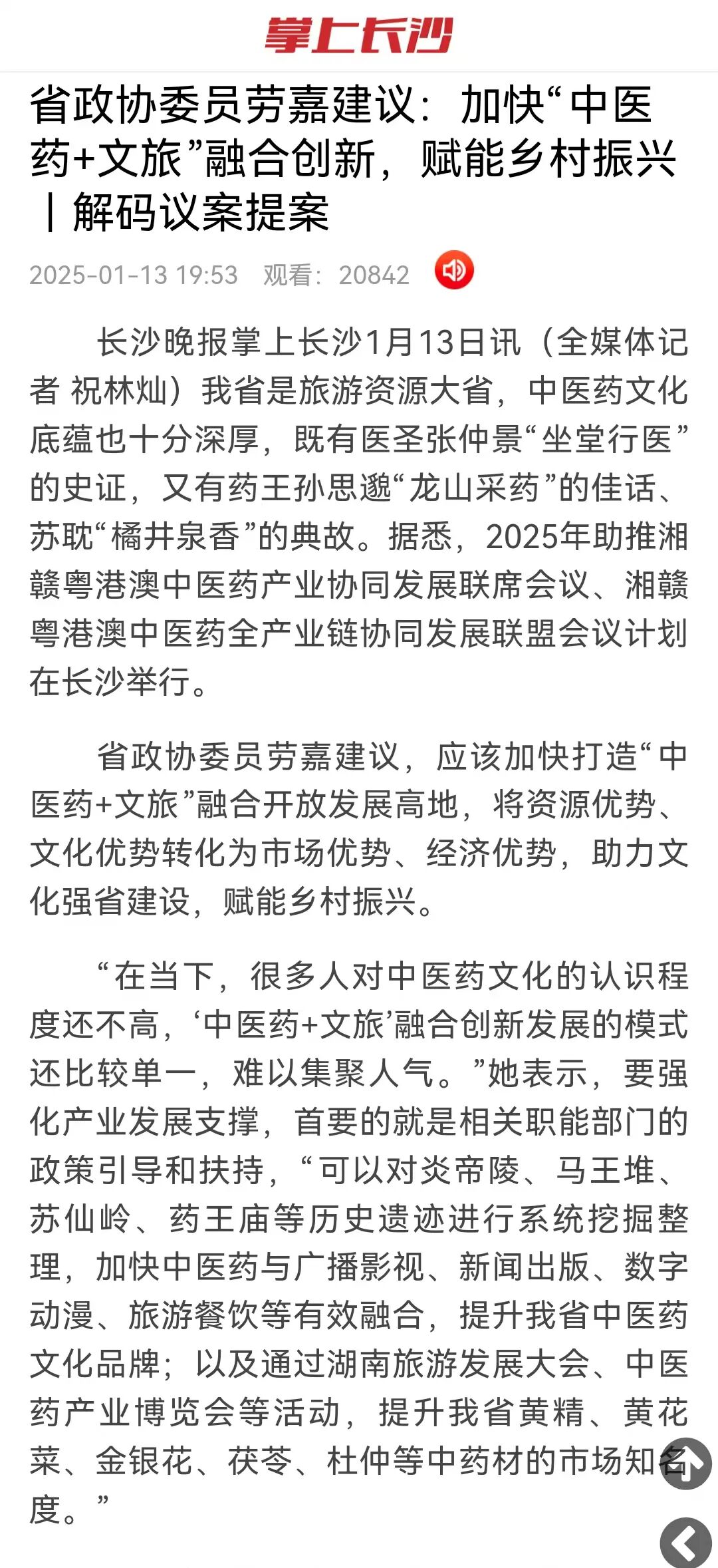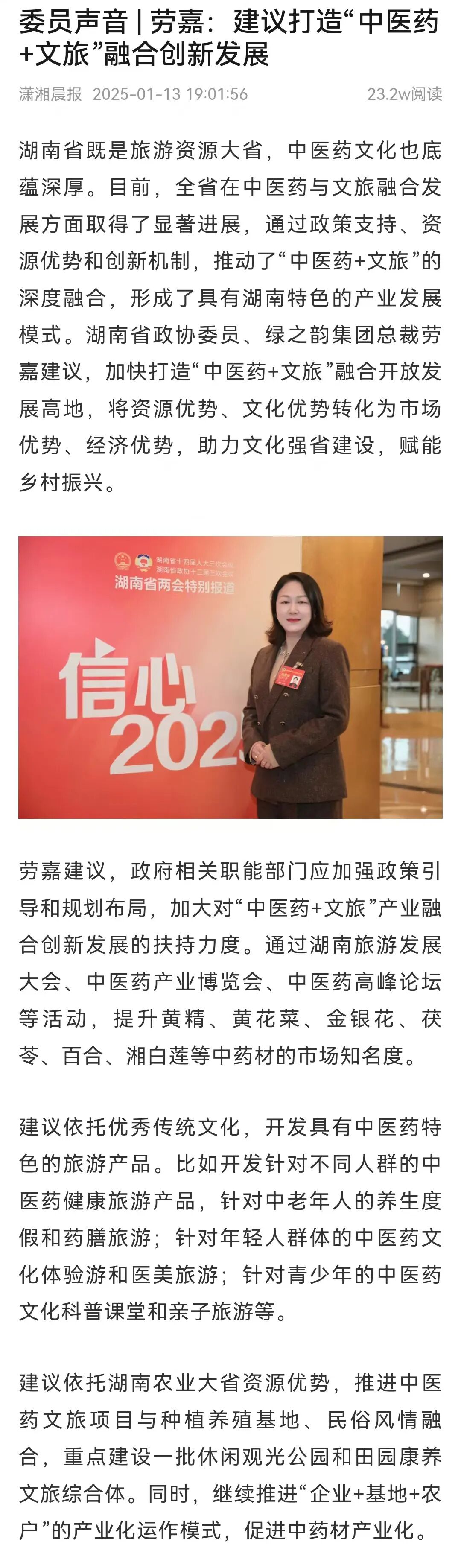 在政協(xié)履職進(jìn)程中,勞嘉委員緊扣時(shí)代發(fā)展脈搏,精準(zhǔn)錨定“中醫(yī)藥+文旅”融合領(lǐng)域,精心提報(bào)的《?關(guān)于打造“中醫(yī)藥+文旅”融合開(kāi)放發(fā)展高地、助力鄉(xiāng)村振興的建議》提案極具前瞻性與建設(shè)性。勞嘉委員深刻洞察到,湖南作為旅游資源大省與中醫(yī)藥文化厚土,雖在中醫(yī)藥與文旅融合已獲初步成果,但仍面臨著中醫(yī)藥文化年輕受眾認(rèn)知不足、產(chǎn)業(yè)模式支持度低、產(chǎn)品創(chuàng)新乏力等問(wèn)題。為此,她建議:政府應(yīng)強(qiáng)化政策引導(dǎo)與規(guī)劃,深度挖掘炎帝陵、馬王堆、蘇仙嶺、藥王廟等遺跡所承載的文化內(nèi)涵,推動(dòng)多業(yè)態(tài)融合發(fā)展,通過(guò)舉辦展會(huì)等形式提升湖南中藥材的知名度;依托湖湘?zhèn)鹘y(tǒng)文化,創(chuàng)新開(kāi)發(fā)中醫(yī)藥保健品以及分眾化的旅游產(chǎn)品,滿足不同群體的需求;大力推進(jìn)農(nóng)業(yè)產(chǎn)業(yè)化進(jìn)程,將文旅產(chǎn)業(yè)與種植養(yǎng)殖、民俗文化相結(jié)合,建設(shè)集多種功能于一體的產(chǎn)業(yè)綜合體與特色小鎮(zhèn);充分借助新媒體平臺(tái)以及微電影等新興傳播形式,廣泛傳播中醫(yī)藥文化,提升社會(huì)各界對(duì)該產(chǎn)業(yè)的認(rèn)知度與參與度,進(jìn)而為鄉(xiāng)村振興提供有力推動(dòng)。瀟湘晨報(bào)、湘聲報(bào)、紅網(wǎng)、長(zhǎng)沙晚報(bào)等主流媒體迅速聚焦勞嘉委員及其提案,紛紛進(jìn)行深度報(bào)道與專題采訪,引發(fā)了社會(huì)各界的廣泛熱議。