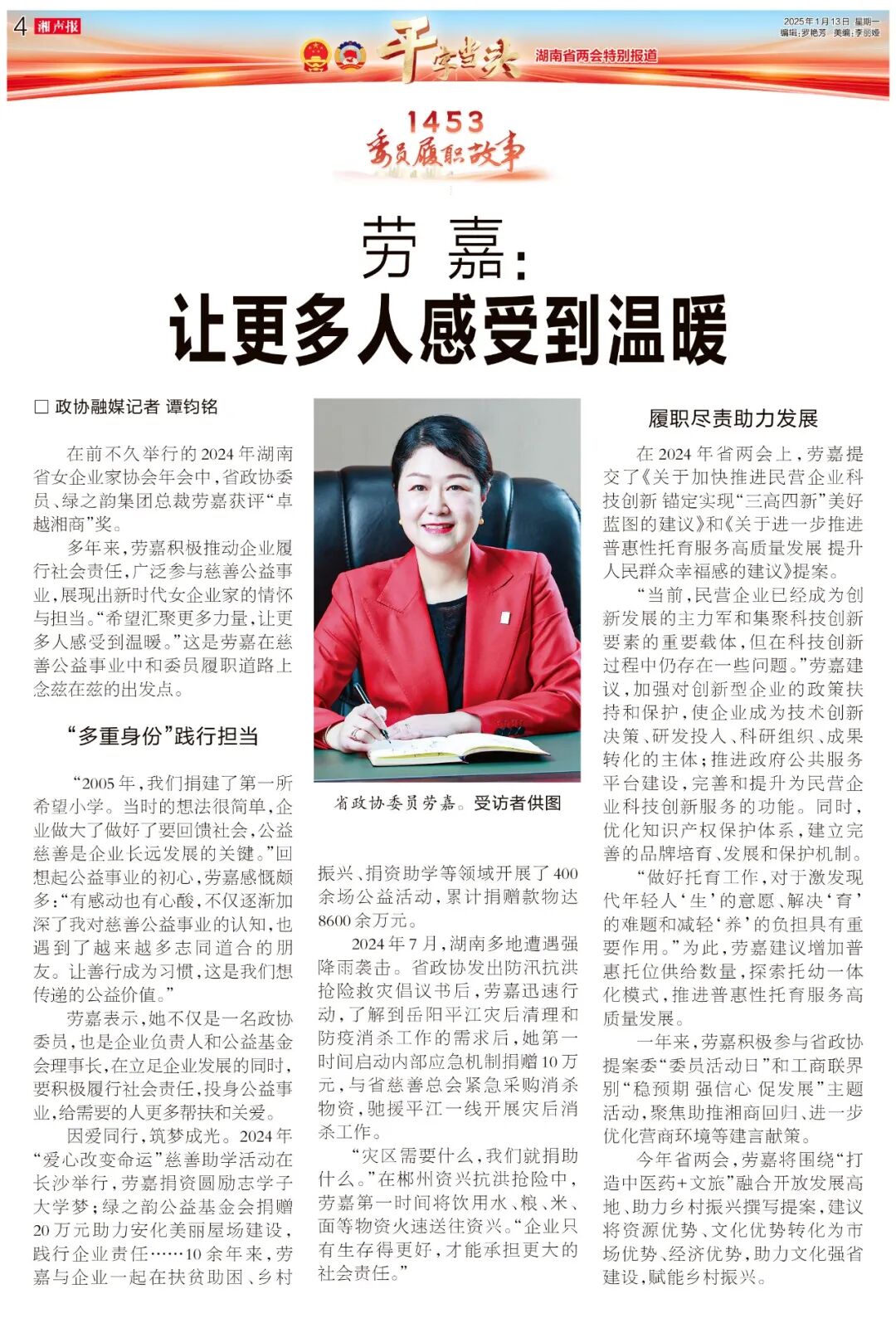 1月14日上午,勞嘉委員以列席身份參與湖南省第十四屆人民代表大會(huì)第三次會(huì)議,與各界代表一同認(rèn)真聽(tīng)取并深入討論了《省政府工作報(bào)告》。報(bào)告憑借詳實(shí)的數(shù)據(jù)與務(wù)實(shí)的規(guī)劃,清晰呈現(xiàn)出湖南在經(jīng)濟(jì)增長(zhǎng)、社會(huì)建設(shè)、科技創(chuàng)新等多個(gè)維度取得的卓越成就,同時(shí)也勾勒出宏偉的發(fā)展目標(biāo)。勞嘉委員全程專注聆聽(tīng),認(rèn)真記錄,力求深刻領(lǐng)會(huì)報(bào)告的精神實(shí)質(zhì)。在分組討論環(huán)節(jié),勞嘉委員積極參與其中,與代表們各抒己見(jiàn)、思想碰撞。大家圍繞省委、省政府的中心工作,聚焦湖南改革發(fā)展的大局,針對(duì)人民群眾普遍關(guān)心的重點(diǎn)問(wèn)題展開(kāi)深入探討與交流。